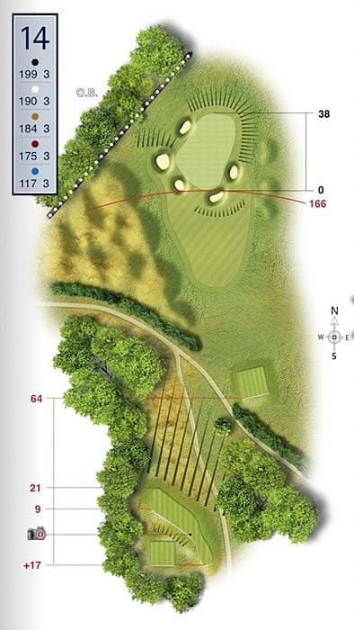 The tee box is on high, an elevation change of some 70 feet from tee to green. It measures 199 yards from the back tees.